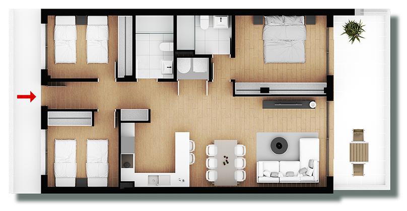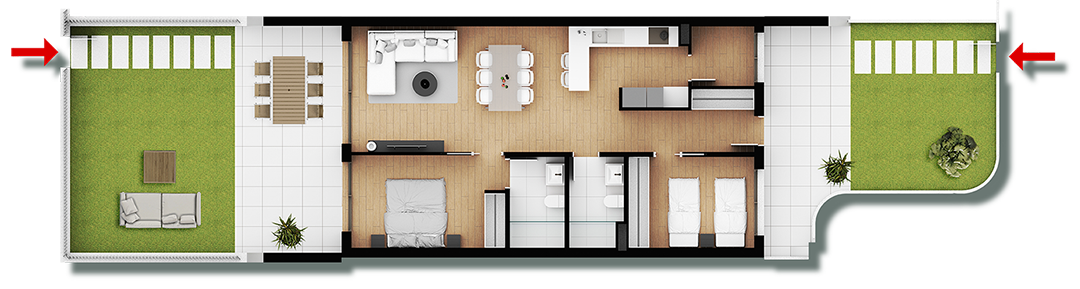 Las viviendas ofrecen distintas tipologías para adaptarse a cada estilo de vida: planta baja con jardín privado, plantas intermedias con amplias terrazas y áticos con solárium privado. Todas disponen de 2 o 3 dormitorios dobles, 2 baños completos y cocina abierta integrada