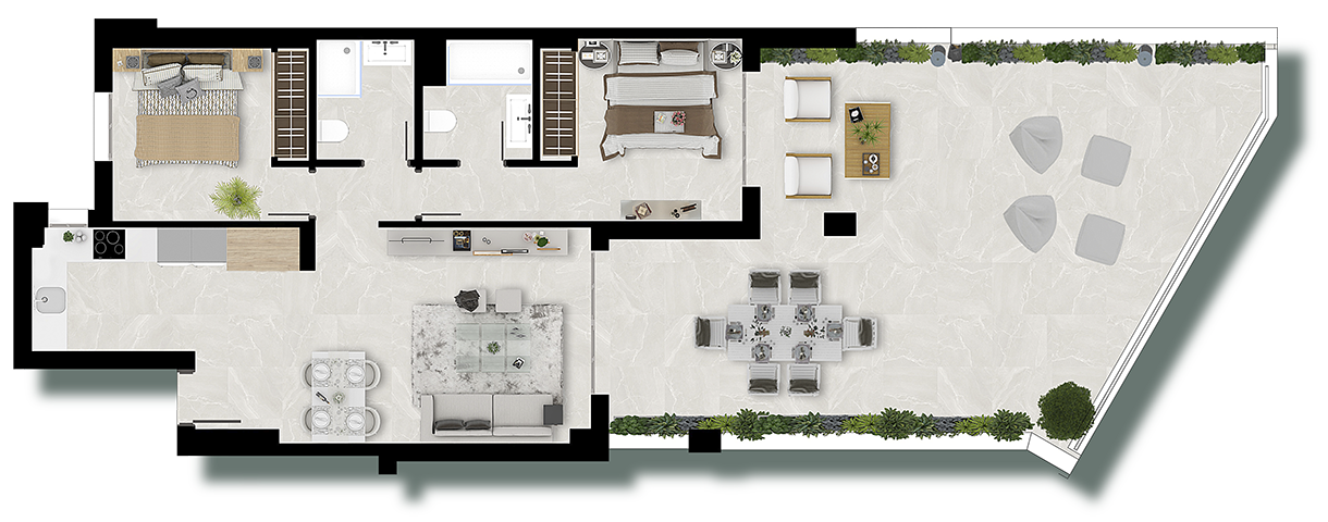 Valley Views destaca por la luz natural que reciben los luminosos apartamentos y amplias terrazas para disfrutar del sol todo el día, y las maravillosas vistas al mar y las montañas.